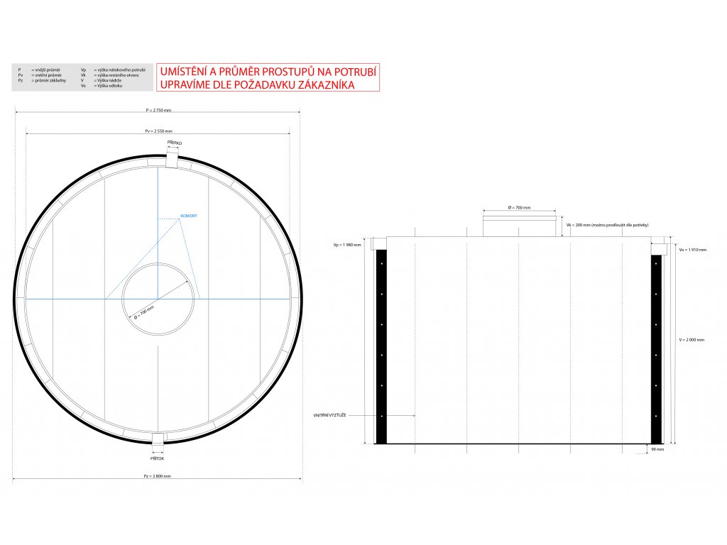 - revizní komínek umožňující přístup do všech komor. Průměr komínku je 700mm, základní výška 200mm. Komínek lze prodloužit nástavcem