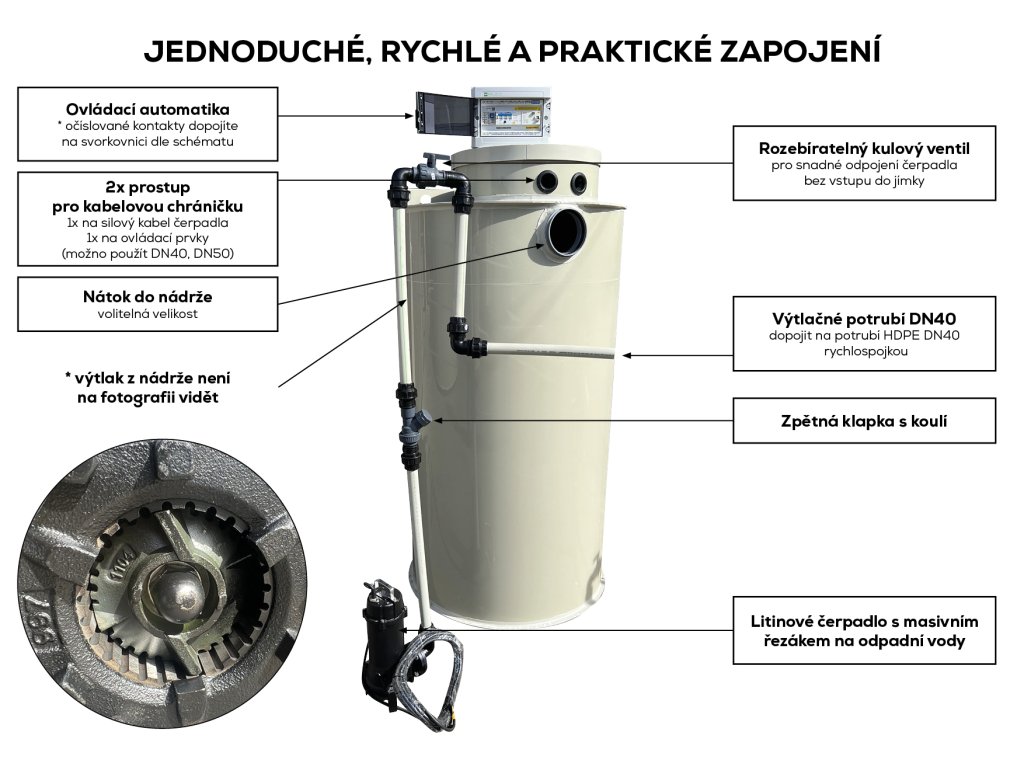 Rozhodně ANO! Celá sestava přečerpávací jímky je navržena tak, že je její instalace velmi jednoduchá a bez problému ji zvládnete! Čerpadlo postavíte do jímky usazené v zemi, vytáhnete kabely a rychlospojkou připojíte výtlačnou hadici v hadici (pouze nasadíte a utáhnete matici). Elektrické zapojení čerpadla a ovládacích prvků je také jednoduché. Všechny kontakty spínacích prvků jsou očíslovány a dle přiloženého schématu se připojí do ovládací automatiky. Toto však raději přenechte elektrikáři.