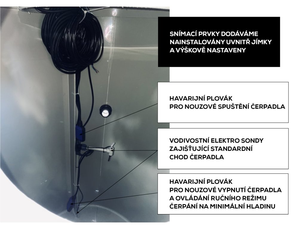 - sada ovládacích prvků (2 elektrosondy + 2 havarijní plováky) připravená na vodící tyči